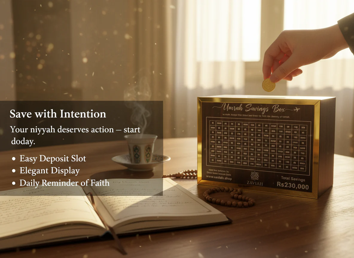 👉 Start your spiritual journey with purpose and planning. The Umrah Savings Box helps you save consistently over 280 days (40 weeks) for your pilgrimage. Crafted from premium wood with elegant Islamic engravings, it serves as both a practical savings tool and a beautiful reminder of your sacred goal.